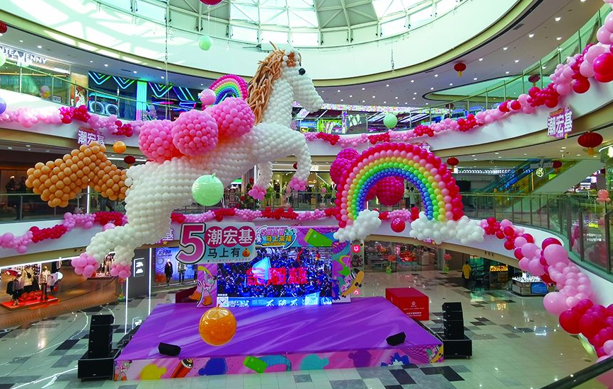 走進(jìn)集寧區(qū)萬達(dá)廣場,一樓東門的跨年倒計(jì)時(shí)展板格外醒目,“約定,今年要和我愛的人一起跨年”的字樣搭配喜慶的紅色背景,將跨年的儀式感拉滿。商場內(nèi)部的布置巧思盡顯,中庭位置,巨型氣球打造的白色小馬造型栩栩如生,粉色、橙色氣球簇?fù)碜笥?,一旁的彩虹氣球裝飾蜿蜒舒展,與各品牌門前統(tǒng)一的彩色氣球相映成趣,簡約的裝飾搭配讓節(jié)日氛圍愈發(fā)濃郁。