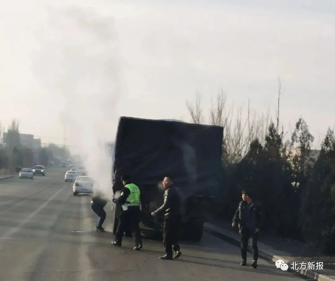 當日,包頭市公安局交管支隊東興大隊第三警務區(qū)民警裴少華、孫建波、趙永來三人巡控至包白公路黃草洼村口北200米處時,發(fā)現(xiàn)迎面駛來的重型半掛牽引車左后側有濃煙飄出,隨即將其攔停,此時車底已岀現(xiàn)明火,三人迅速拿起滅火器,并前往附近商戶打水全力滅火,20分鐘后火被撲滅。經(jīng)過初步了解,火源為剎車抱死導致。