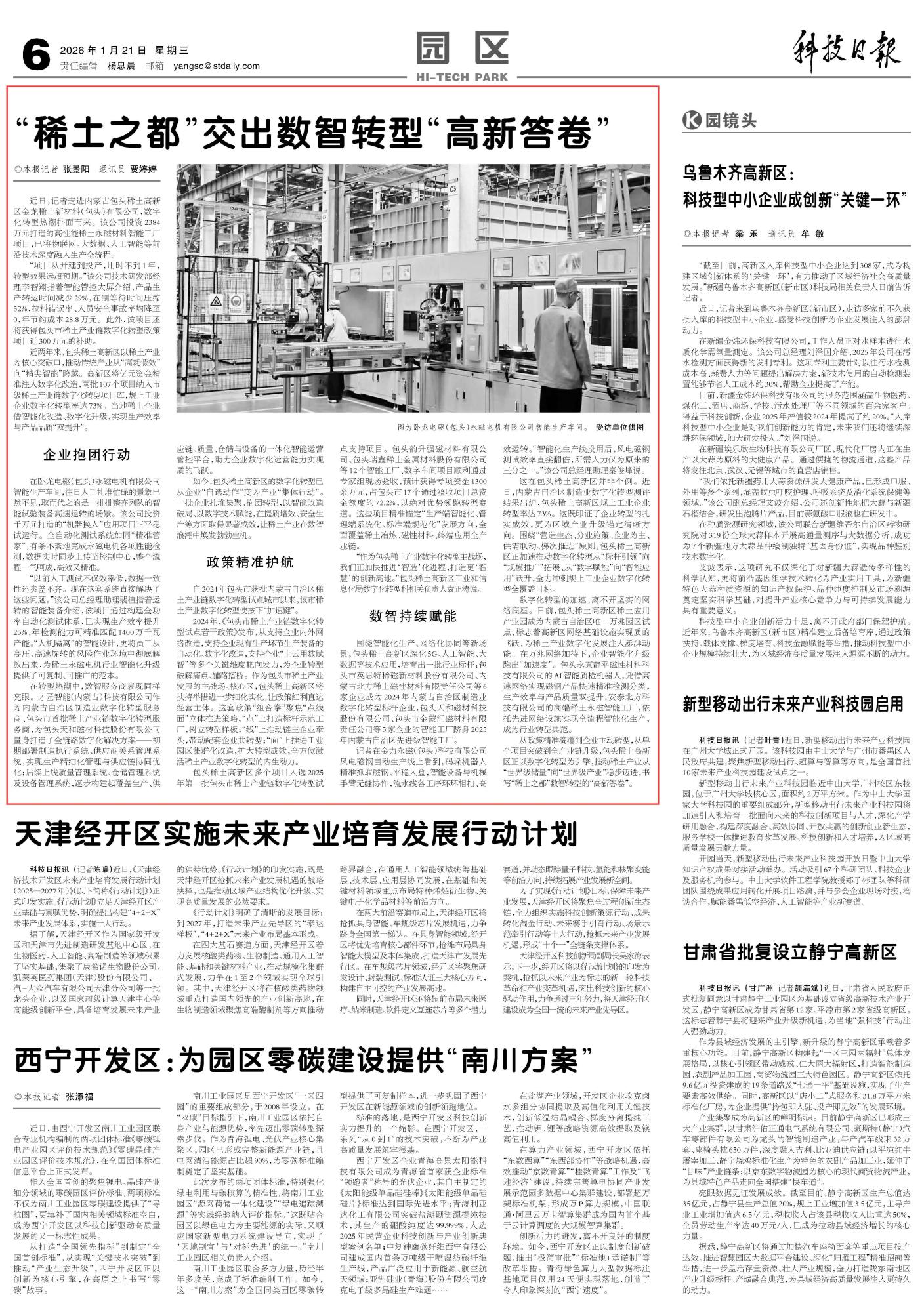 2026年1月21日《科技日?qǐng)?bào)》第6版刊發(fā)了《“稀土之都”交出數(shù)智轉(zhuǎn)型“高新答卷”》的文章,報(bào)道了從政策精準(zhǔn)滴灌到企業(yè)主動(dòng)轉(zhuǎn)型,從單個(gè)項(xiàng)目突破到全產(chǎn)業(yè)鏈升級(jí),包頭稀土高新區(qū)正以數(shù)字化轉(zhuǎn)型為引擎,推動(dòng)稀土產(chǎn)業(yè)從“世界級(jí)儲(chǔ)量”向“世界級(jí)產(chǎn)業(yè)”穩(wěn)步邁進(jìn),書寫“稀土之都”數(shù)智轉(zhuǎn)型的“高新答卷”。