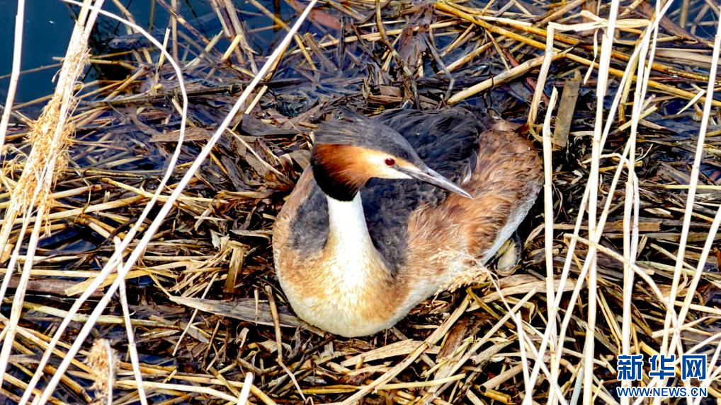 5月29日,在赤峰市松山區(qū)銀河谷濕地,鳳頭鸊鷉在巢中孵化幼鳥(niǎo)。