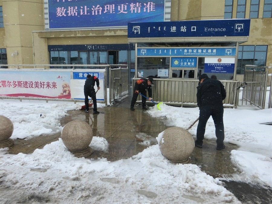 4月3日,受極端惡劣天氣影響,鄂爾多斯市東勝東車站派出所轄區(qū)內(nèi)連降雨夾雪,車站進(jìn)出站口積雪、積水嚴(yán)重,給旅客群眾出行帶來不便。