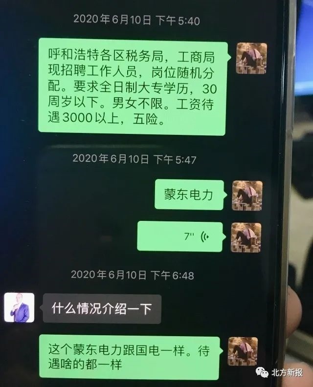 “呼和浩特各區(qū)消防大隊招聘辦公室內(nèi)勤人員,工資待遇3500元左右?!薄案咚俳痪羰兄ш?一支隊)輔警,工資和五險一金,4200元?!薄昂艉秃铺馗鲄^(qū)稅務(wù)局、工商局現(xiàn)招聘工作人員,崗位隨機分配?!薄昂艉秃铺貗D幼保健院招聘護士,大專學歷”……記者在民警繳獲的程某某的手機上看到,6月8日以來,程某某和趙某某的聊天記錄中,發(fā)送了多條諸如此類的招聘信息。