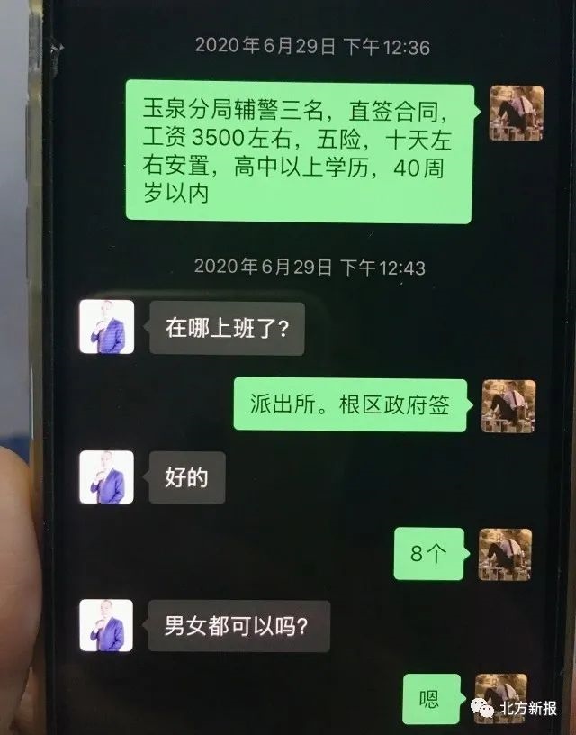 6月30日,大南街派出所民警在日常工作中發(fā)現(xiàn),有人在朋友圈發(fā)布了這樣一條信息:“玉泉區(qū)公安分局招聘輔警3名,直簽合同,工資3500元左右,五險,十天左右安置,高中以上學歷……”信息末尾留有手機號碼。