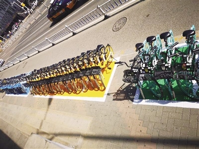 7月23日上午,記者來(lái)到呼和浩特火車(chē)站門(mén)前,遠(yuǎn)遠(yuǎn)就被火車(chē)站東側(cè)馬路道牙上的多彩顏色所吸引。原來(lái)這里被畫(huà)上了藍(lán)色、綠色和黃色的停車(chē)區(qū)域,一排排各品牌共享單車(chē)也根據(jù)車(chē)身顏色有序停放著。