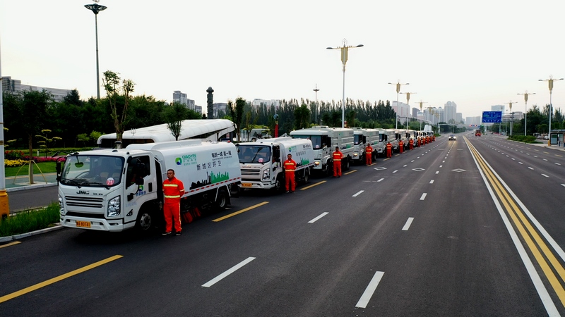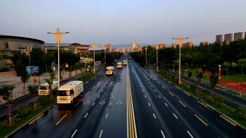當(dāng)東方微微發(fā)白,高壓沖洗車(chē)強(qiáng)力開(kāi)路,將道路上的廢棄物、積灰沖到道路兩側(cè)。