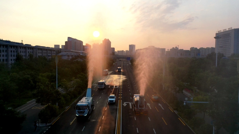 凌晨6點(diǎn),晨曦初露,朝霞輕染,被稱(chēng)作“高霧炮”的多功能抑塵車(chē)和高壓水車(chē)開(kāi)始霸氣地聯(lián)合作業(yè),一道道水霧騰空而起或四散鋪開(kāi),清潔降塵,提高空氣濕度。