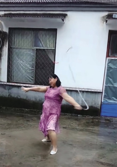 “清水河”大媽與抖音的相遇是在3年前。當時,遭遇了親人離世的她悲傷難抑,為了讓她分散注意力,她的女兒幫她下載了抖音。此后,大媽時常刷刷抖音,也慢慢從中悟出了一個道理,就是生活中不如意十之八九,人要好好活著,要快樂地活著。很快,大媽就從悲傷中走了出來,也學著在抖音上拍攝自己的日常。雖然起初視頻點贊量不多,但能記錄下生活的點滴足以讓她格外開心。一直到了去年9月份,大媽無意之中發(fā)布了一條雨中甩鞭子的視頻。視頻中,大媽身著一襲紅裙,有節(jié)奏地甩起了十幾斤重的鐵制麒麟鞭。“啪嗒、啪嗒、啪嗒……”聲聲響亮、威風凜凜。就是這條視頻讓她一夜爆紅。此后短短幾天,這條視頻的點贊量就突破了200萬,一時間,抖音上還掀起了一陣和大媽合拍的熱潮。