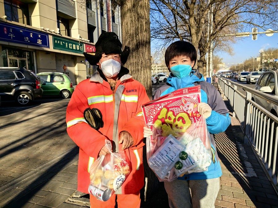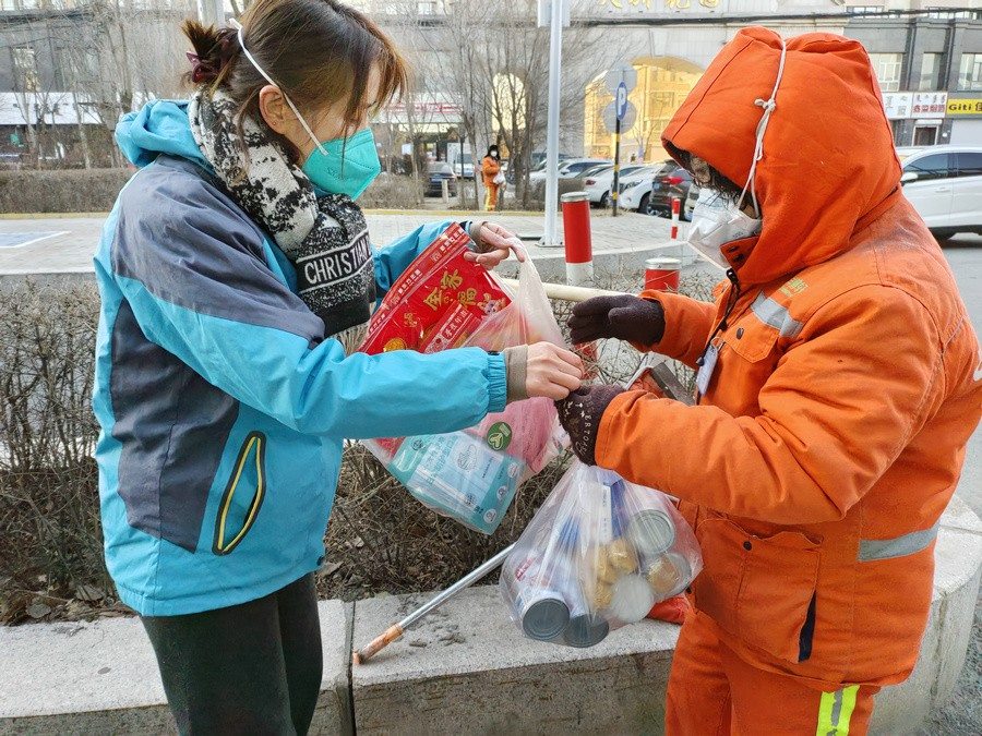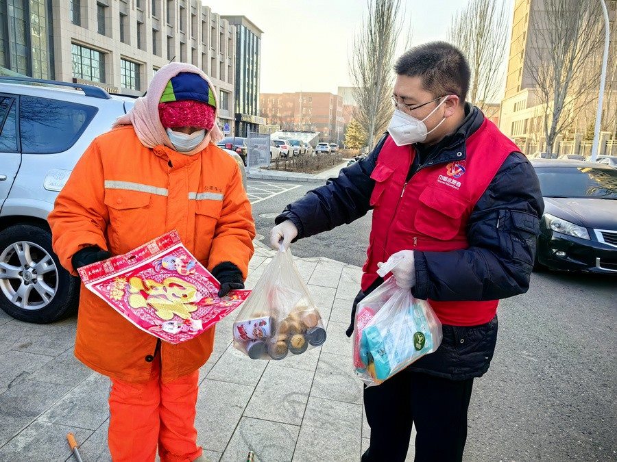 大家身穿志愿者馬甲,三五人一組結(jié)伴走上街頭,只要見到正在工作的環(huán)衛(wèi)工人,就會遞上一份節(jié)日暖心包,里面有臘八粥、小點(diǎn)心、春聯(lián)福字、兔年吉祥物裝飾卡片,還有酒精、口罩等防疫物資。