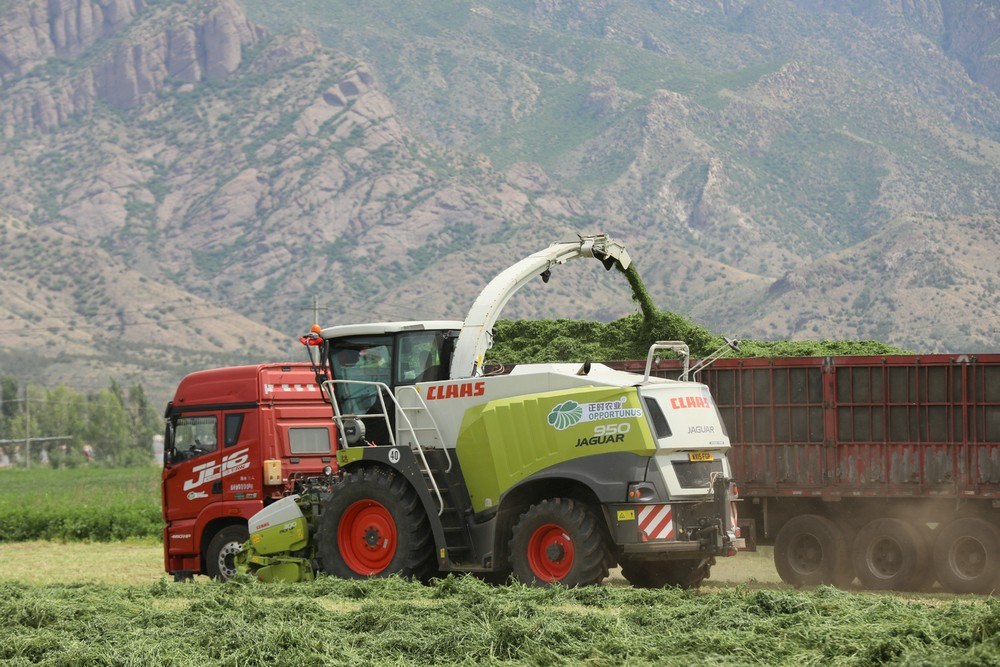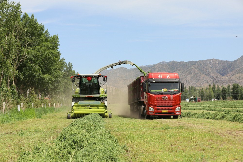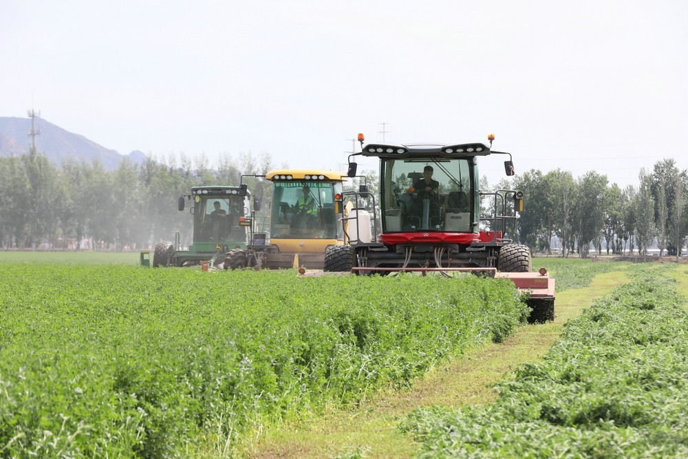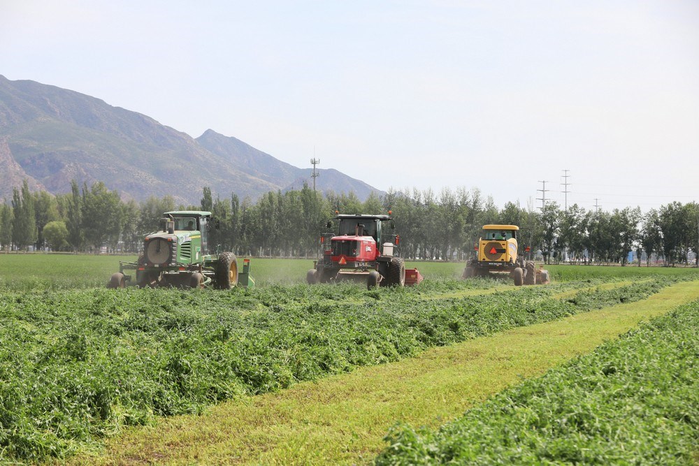 紫花苜蓿是多年生草本植物,因其產(chǎn)量高、生長周期短、再生能力強,是優(yōu)質(zhì)的高蛋白牧草。當(dāng)天,收割令一下,3臺大型收割機械同時開動,如同巨輪駛?cè)刖G色海洋,場面壯觀。割下的紫花苜蓿就地晾曬,待苜蓿中水分含量下降后,再進(jìn)行粉碎、裹包,然后進(jìn)行貯存,提供給牧場作為青貯飼料。