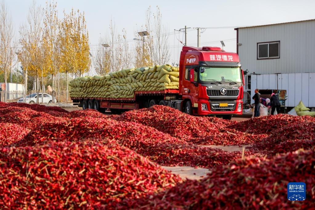 10月25日,在開魯縣東風(fēng)鎮(zhèn)一家紅干椒銷售企業(yè)的廠區(qū)內(nèi),裝滿紅干椒的卡車準(zhǔn)備開往四川。新華社記者 連振 攝