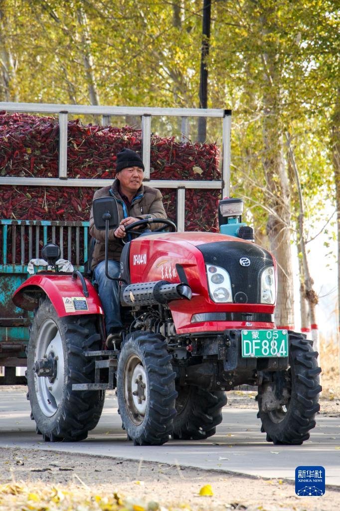 10月25日,在開魯縣東風(fēng)鎮(zhèn)東方紅村,村民駕駛拖拉機運輸紅干椒。新華社記者 連振 攝