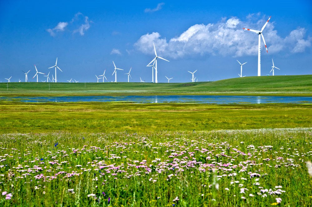 “輝騰錫勒”蒙古語(yǔ)意為“清涼的山崗”,因風(fēng)力資源豐富而得名,是建設(shè)風(fēng)電場(chǎng)理想的場(chǎng)所。如今,一排排風(fēng)電機(jī)猶如“白色森林”,碩大的風(fēng)翼就像一架架“大風(fēng)車”,在草原勁風(fēng)吹動(dòng)下緩緩轉(zhuǎn)動(dòng),形成另一大景觀。