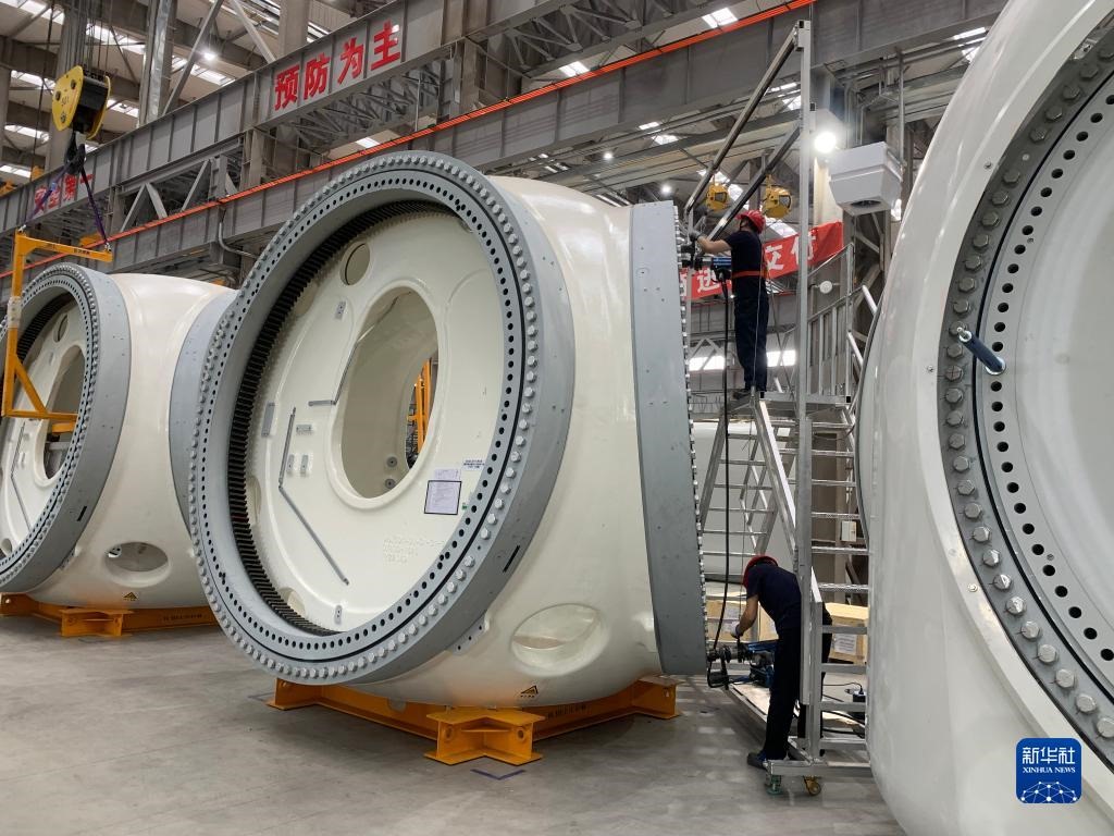 “公司2020年12月在烏蘭察布市注冊成立,今年5月中旬建成投產(chǎn),如今已具備每天生產(chǎn)2臺套風機的生產(chǎn)能力?!痹跒跆m察布運達風電有限公司的生產(chǎn)車間里,公司副總經(jīng)理常偉指著一臺正在組裝的風機說,“我國風機研發(fā)能力及技術水平正逐年向國際水平靠攏,曾經(jīng)風機的單機容量只有750千瓦,目前我們車間里生產(chǎn)的風機單機容量已超過6000千瓦?!?/p>