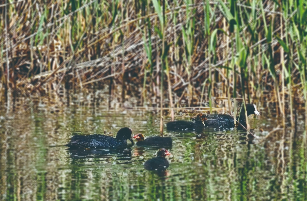 在不遠(yuǎn)處的水域,白骨頂雞一家成為眾人關(guān)注的焦點。幾只剛剛出窩的幼鳥,圓滾滾、毛茸茸的,正好奇地在水中游動,動作略顯笨拙,還不時發(fā)出稚嫩的叫聲。成年白骨頂雞則忙著覓食,它們一頭扎進水里,再浮出水面時,嘴里已叼著小魚小蝦,隨后快速游向幼鳥喂食。幼鳥們爭搶食物的場景,充滿了趣味。