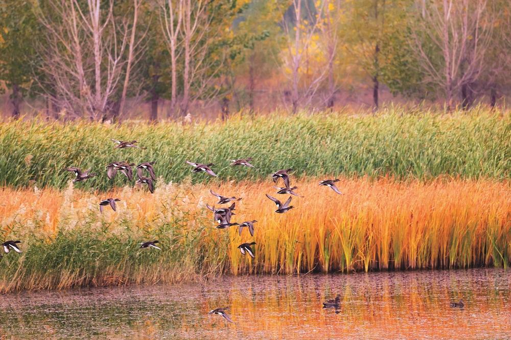沿著黃河岸邊的公路前行,不遠處便是龍游灣國家濕地公園。這里的秋景更是別有一番風味。樹木褪去了翠綠,換上了耀眼的金黃,廣袤的田野里,一捆捆草垛錯落有致地散布在草地上,訴說著豐收的喜悅。遠處的蘆葦蕩與天際線相連,蘆葦花在風中輕舞,時而聚攏、時而散開,與水面上掠過的水鳥構(gòu)成靈動的剪影。林間的候鳥也多了起來,一群群白鷺在水面上盤旋,偶爾俯沖下去,叼起一條小魚,然后又展翅飛向遠方,給這片寧靜的濕地增添了幾分生機與活力。
