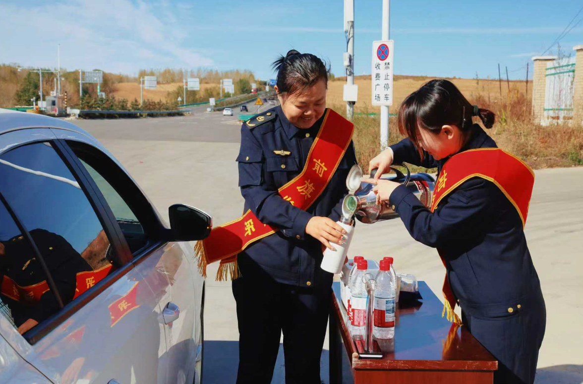 工作人員為過(guò)往司乘提供熱水