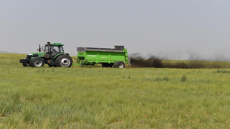 在退化放牧場治理區(qū),施工人員用推土機推平坑洼不平的風蝕坑、整理棄土堆;按照噴幅寬6~8米的行距,用拋肥機將牛羊固態(tài)糞肥和含有氮、磷、鉀等生物有機液態(tài)肥拋灑在草場上,增加土壤肥力;用切根機將稀疏的羊草切開、促進分蘗繁殖、復壯,增加種群密度;采用栽設4×4米網(wǎng)格狀沙幛、覆蓋草簾來降溫保墑抗旱保苗,與此同時與項目區(qū)牧戶簽訂三年的禁牧、生態(tài)補償、管護協(xié)議。
