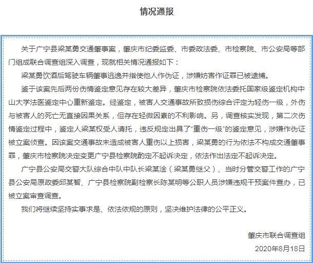 據(jù)肇慶市官方發(fā)布公眾號(hào)“肇慶發(fā)布”消息,關(guān)于廣寧縣梁某勇交通肇事案,肇慶市紀(jì)委監(jiān)委、市委政法委、市檢察院、市公安局等部門組成聯(lián)合調(diào)查組深入調(diào)查,通報(bào)相關(guān)情況:梁某勇飲酒后駕駛車輛肇事逃逸并指使他人作偽證,涉嫌妨害作證罪已被逮捕。