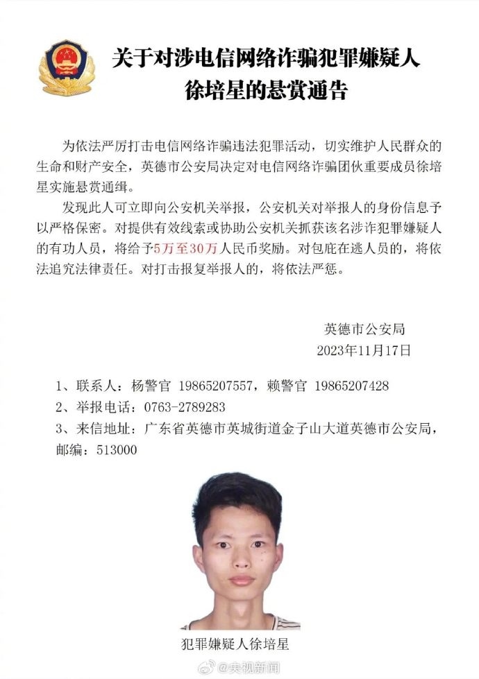 近日,廣東英德市公安局對電信網(wǎng)絡(luò)詐騙團伙重要成員張永勝、丘小雄、徐培星、張方文、巫昌發(fā)、鄧寶運、鄧海堅實施懸賞通緝。發(fā)現(xiàn)上述人員立即向公安機關(guān)舉報,對提供有效線索或協(xié)助公安機關(guān)抓獲該名涉詐犯罪嫌疑人的有功人員,將給予5萬至30萬人民幣獎勵。