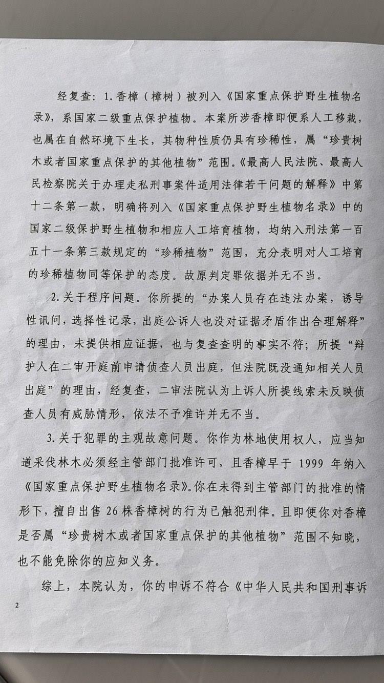 一審判決下達(dá)后,馬萬林及謝某林均提出上訴。瀘州市中院在二審時(shí)沿用了敘永縣法院一審判決所適用法律規(guī)定,同時(shí)認(rèn)為所砍伐的26棵香樟樹屬于自然環(huán)境內(nèi)生長,即便是人工移栽也未改變自然環(huán)境對香樟成長的決定性影響。香樟樹無論是野生還是人工培育,均未改變其物種性質(zhì),同樣具有珍稀性,系國家禁止、限制出口的珍稀植物,屬于刑法第三百四十條規(guī)定的“珍貴樹木或者國家重點(diǎn)保護(hù)的其他植物?!币虼?,馬萬林、謝某林認(rèn)為人工栽植的香樟不屬于國家重點(diǎn)保護(hù)植物的上訴理由不能成立,該院不予支持。