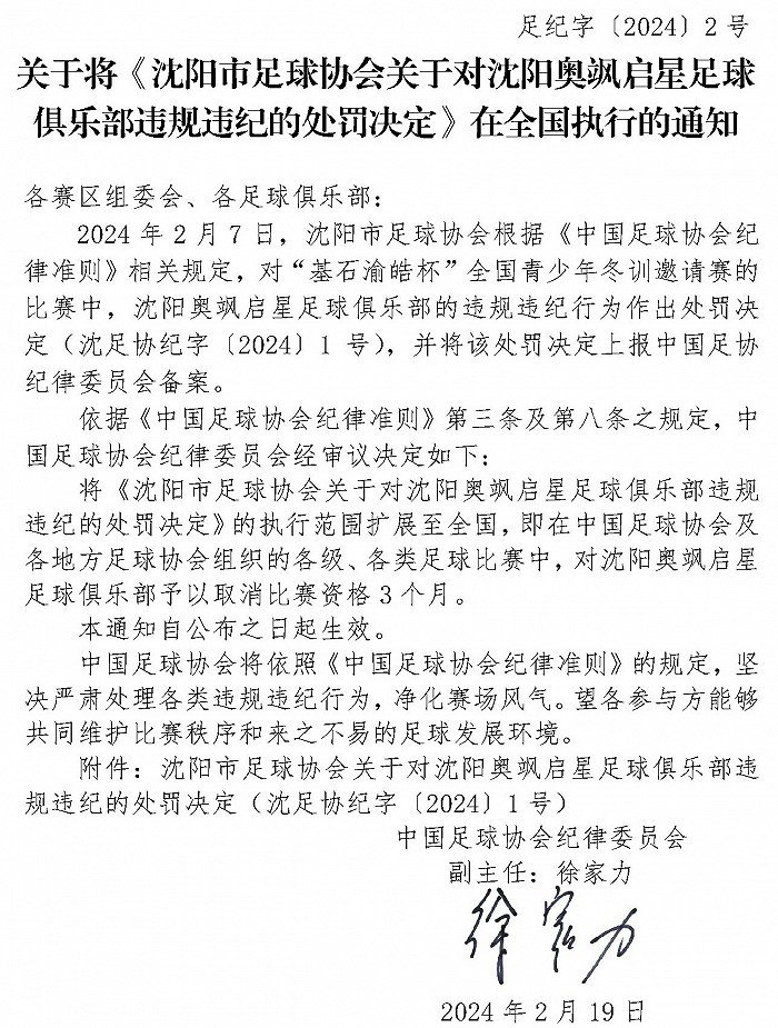 央視網(wǎng)消息:據(jù)中國(guó)足球協(xié)會(huì)2月21日發(fā)布通知,將《沈陽(yáng)市足球協(xié)會(huì)關(guān)于對(duì)沈陽(yáng)奧颯啟星足球俱樂(lè)部違規(guī)違紀(jì)的處罰決定》及《遼寧省足球運(yùn)動(dòng)協(xié)會(huì)關(guān)于對(duì)教練員吳高俊違規(guī)違紀(jì)的處罰決定》在全國(guó)執(zhí)行,具體內(nèi)容如圖: