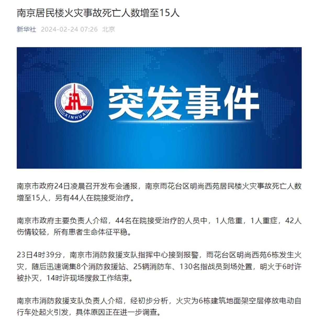 2月24日凌晨,南京市召開(kāi)新聞發(fā)布會(huì),通報(bào)雨花臺(tái)區(qū)“2·23”火災(zāi)事故有關(guān)情況。發(fā)布會(huì)上介紹,23日凌晨4時(shí)39分,南京市消防救援支隊(duì)指揮中心接到報(bào)警,雨花臺(tái)區(qū)明尚西苑6棟發(fā)生火災(zāi)。本次事故現(xiàn)場(chǎng)明火于當(dāng)日上午6時(shí)左右被撲滅,現(xiàn)場(chǎng)搜救工作于下午2時(shí)全部結(jié)束。截至23日24時(shí),事故共造成15人遇難,44人在院治療,其中,1人危重,1人重癥,42人傷情較輕,所有患者生命體征平穩(wěn)。南京市消防救援支隊(duì)負(fù)責(zé)人介紹,經(jīng)初步分析,火災(zāi)為6棟建筑地面架空層電動(dòng)自行車停放處起火引發(fā),具體原因正在進(jìn)一步調(diào)查。