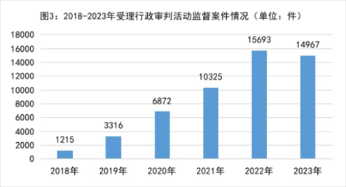 3.行政審判活動(dòng)監(jiān)督更有實(shí)效。2018年以來(lái)受理行政審判活動(dòng)監(jiān)督案件分別是:2018年1215件、2019年3316件、2020年6872件、2021年10325件、2022年15693件,年均增加89.6%。經(jīng)過(guò)連續(xù)五年監(jiān)督,監(jiān)督效果初步體現(xiàn)。2023年共受理14967件,同比下降4.6%。其中,依職權(quán)受理占95.5%;依申請(qǐng)受理占4.5%。針對(duì)超期立案、超期審理、違反規(guī)定送達(dá)法律文書(shū)等審判程序違法問(wèn)題,向法院提出檢察建議13491件,同比下降6.8%。