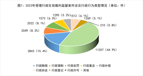 4.案涉行政行為類(lèi)型中,行政賠償、行政強(qiáng)制、行政處罰等類(lèi)案件占比較高,行政許可類(lèi)案件處于低位。行政檢察監(jiān)督案件涉及的行政行為類(lèi)型較為廣泛,從2023年行政生效裁判監(jiān)督案件情況看,涉及行政賠償類(lèi)案件3843件、行政強(qiáng)制類(lèi)案件2049件、行政處罰類(lèi)案件2022件、行政復(fù)議類(lèi)案件1573件、行政補(bǔ)償類(lèi)案件1290件、行政協(xié)議類(lèi)案件1512件、行政登記類(lèi)案件1269件,這七類(lèi)案件約占54.3%。特別指出的是,由于“放管服”改革的深入推進(jìn),近年來(lái)涉行政許可類(lèi)行政生效裁判監(jiān)督案件始終處于低位,2023年辦理此類(lèi)案件210件,占比僅為0.8%。