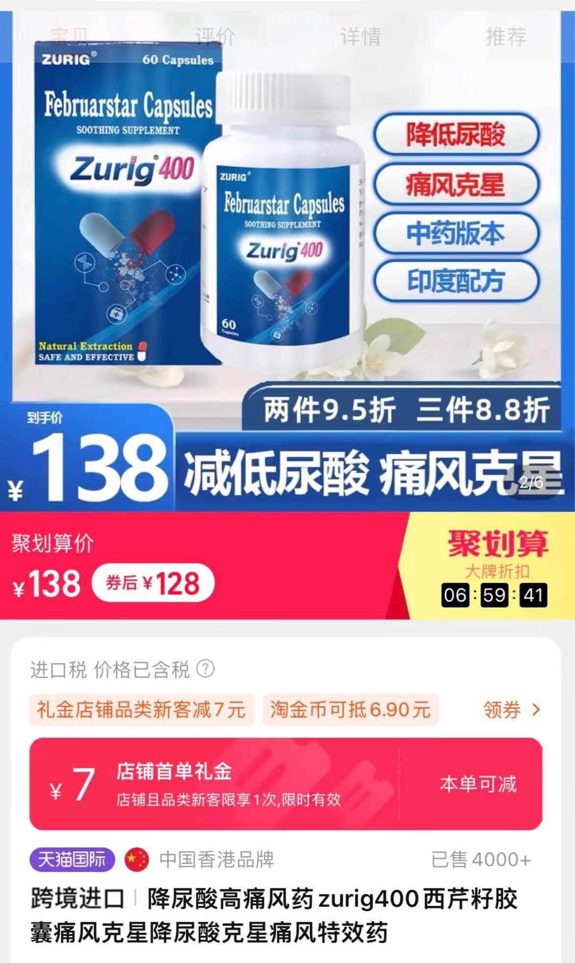 此外,zurig400在銷售頁面還模仿印度zurig80,宣稱降尿酸、痛風(fēng)藥。澎湃新聞?dòng)浾哒{(diào)查發(fā)現(xiàn),zurig400目前在多個(gè)網(wǎng)購平臺有售,有商家顯示已出售4000+。 經(jīng)了解后得知,印度zurig80實(shí)際上是一款仿制藥,目前國內(nèi)并未獲批上市;而zurig400卻是一款香港產(chǎn)的保健品類目產(chǎn)品,并非藥品。但產(chǎn)品宣傳時(shí)卻使用“痛風(fēng)特效藥”“印度配方”“中藥非布”等詞語,讓患者產(chǎn)生誤會(huì)。