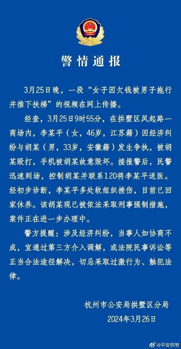 女子欠錢被男子拖下扶梯?杭州警方:涉經(jīng)濟(jì)糾紛 切忌采取過激行為