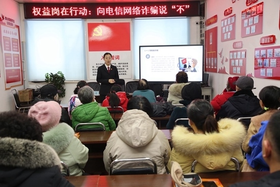 吉林省吉林市船營區(qū)人民法院在向陽街道北安社區(qū)開展“向電信網(wǎng)絡詐騙說‘不’”普法講座。