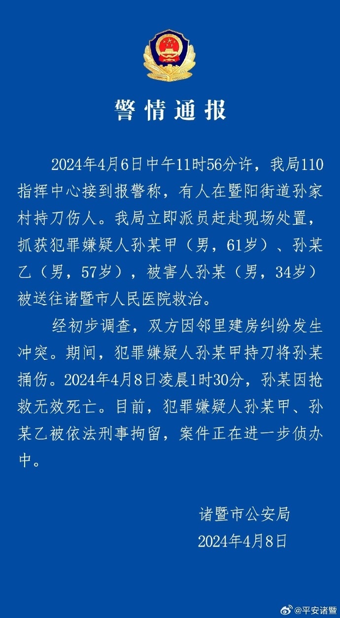 央視網(wǎng)消息:4月8日,浙江諸暨市公安局通報:4月6日中午11時56分許,我局110指揮中心接到報警稱,有人在暨陽街道孫家村持刀傷人。我局立即派員趕赴現(xiàn)場處置,抓獲犯罪嫌疑人孫某甲(男,61歲)、孫某乙(男,57歲),被害人孫某(男,34歲)被送往諸暨市人民醫(yī)院救治。經(jīng)初步調(diào)查,雙方因鄰里建房糾紛發(fā)生沖突。期間,犯罪嫌疑人孫某甲持刀將孫某捅傷。2024年4月8日凌晨1時30分,孫某因搶救無效死亡。目前,犯罪嫌疑人孫某甲、孫某乙被依法刑事拘留,案件正在進一步偵辦中。