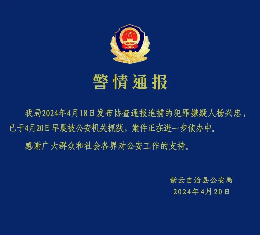 央視網(wǎng)消息:據(jù)“紫云公安”官微消息,紫云自治縣公安局4月18日發(fā)布協(xié)查通報追捕的犯罪嫌疑人楊興忠,已于4月20日早晨被公安機關抓獲,案件正在進一步偵辦中。
