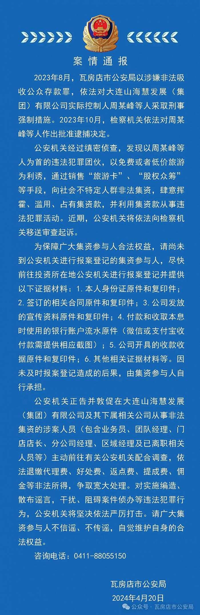 央視網(wǎng)消息:據(jù)瓦房店市公安局官微消息,遼寧瓦房店市公安局通報(bào),2023年8月,瓦房店市公安局以涉嫌非法吸收公眾存款罪,依法對(duì)大連山?;郯l(fā)展(集團(tuán))有限公司實(shí)際控制人周某峰等人采取刑事強(qiáng)制措施。2023年10月,檢察機(jī)關(guān)依法對(duì)周某峰等人作出批準(zhǔn)逮捕決定。公安機(jī)關(guān)經(jīng)過(guò)縝密偵查,發(fā)現(xiàn)以周某峰等人為首的違法犯罪團(tuán)伙,以免費(fèi)或者低價(jià)旅游為利誘,通過(guò)銷售“旅游卡”、“股權(quán)眾籌”等手段,向社會(huì)不特定人群非法集資,肆意揮霍、濫用、占有集資款,并利用集資款從事違法犯罪活動(dòng)。近期,公安機(jī)關(guān)將依法向檢察機(jī)關(guān)移送審查起訴。