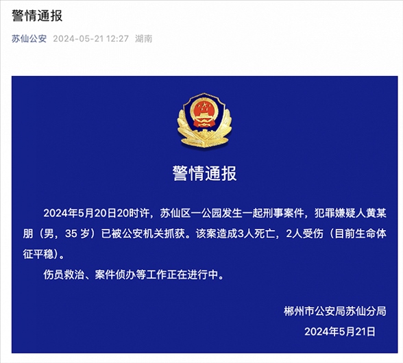 央視網(wǎng)消息:據(jù)蘇仙公安微信公眾號消息,5月20日20時許,蘇仙區(qū)一公園發(fā)生一起刑事案件,犯罪嫌疑人黃某朋(男,35歲)已被公安機關抓獲。該案造成3人死亡,2人受傷(目前生命體征平穩(wěn))。傷員救治、案件偵辦等工作正在進行中。