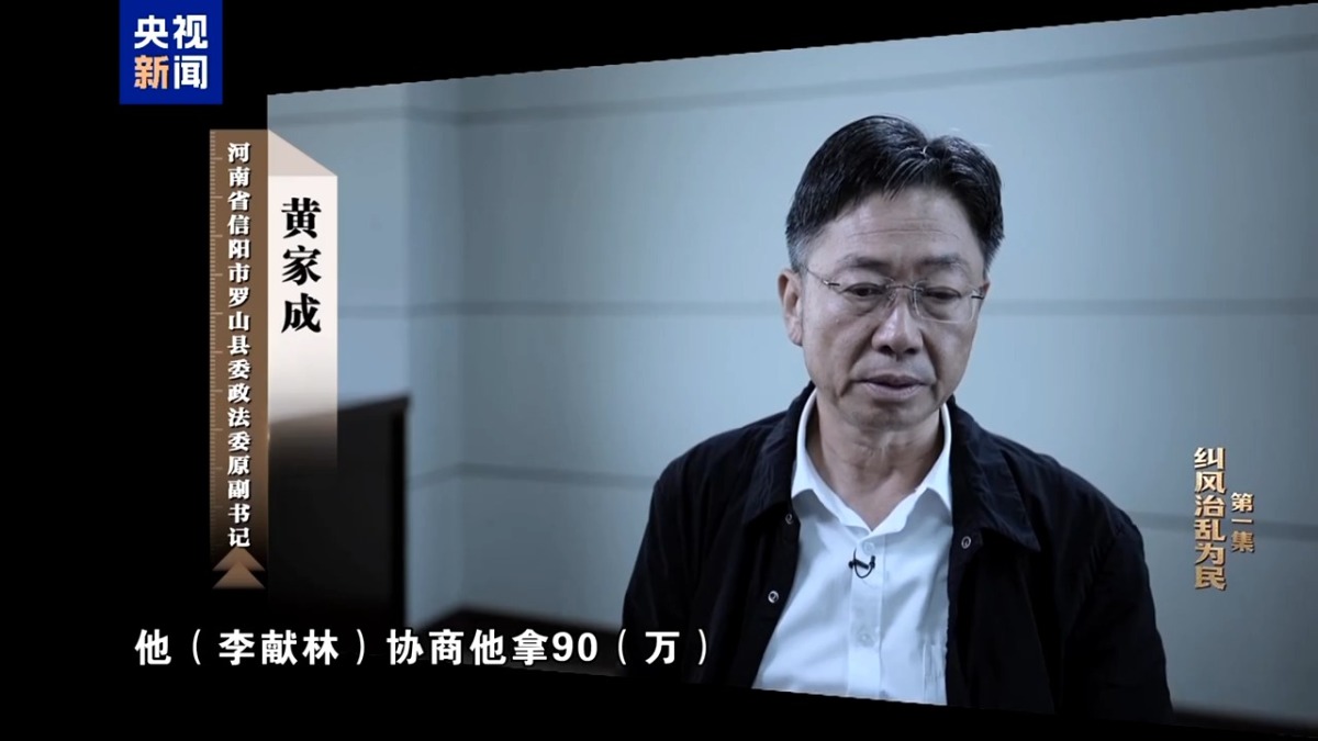 河南省信陽市羅山縣委政法委原副書記 黃家成:李獻林協(xié)商他拿90萬,段巍巍和汪海洋各拿80萬,我拿20萬,方建兵拿10萬。