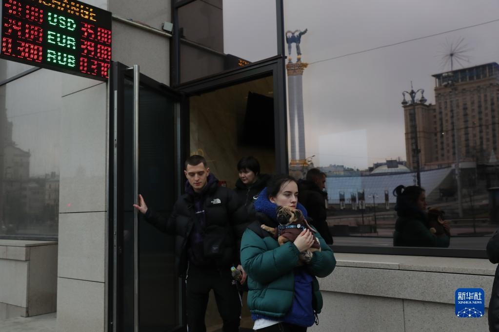 2月24日,在烏克蘭基輔,當(dāng)?shù)鼐用駨囊惶帗Q匯點離開。新華社記者 李東旭 攝
