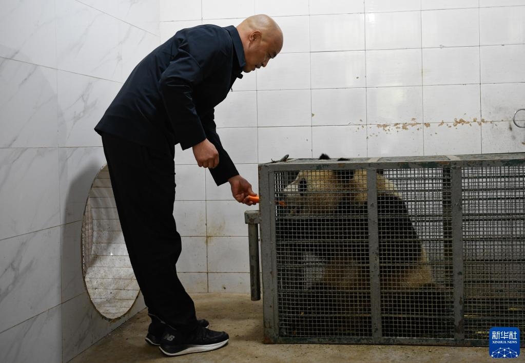 10月18日,在中國大熊貓保護研究中心雅安基地,飼養(yǎng)師董禮用胡蘿卜安撫進入轉運籠的大熊貓“四?!?。新華社記者 胥冰潔 攝