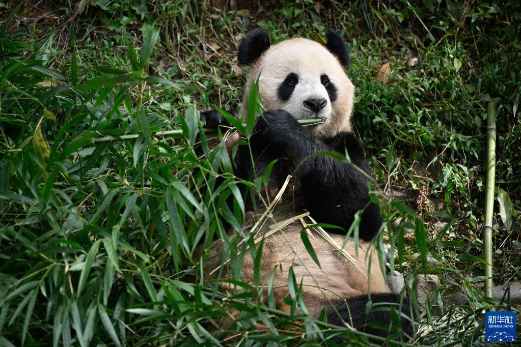 10月17日,在中國大熊貓保護研究中心雅安基地,大熊貓“四?!痹诔灾褡?。新華社發(fā)(陳居偉 攝)