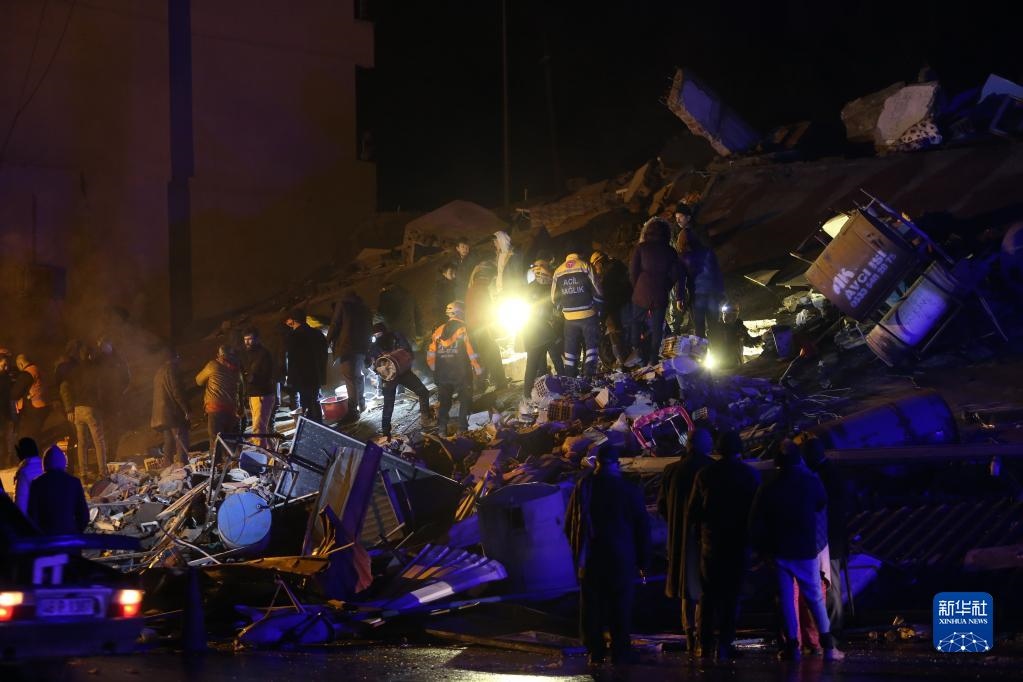 2月6日,在敘利亞拉塔基亞省杰卜萊,人們?cè)谝惶幍顾慕ㄖF(xiàn)場進(jìn)行救援。新華社發(fā)