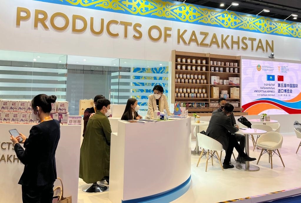 這是2022年11月6日在第五屆進博會上拍攝的哈薩克斯坦產(chǎn)品展區(qū)。