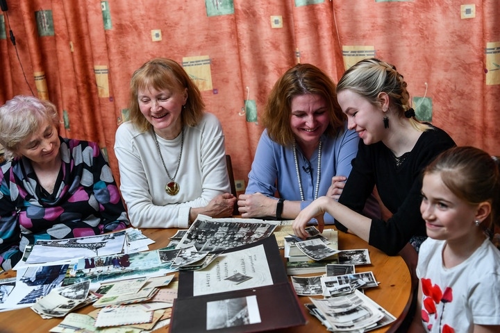 3月9日,援華專家西林之女葉蓮娜 (左一)和家人在接受新華社記者采訪時(shí),一起翻看老照片。新華社記者曹陽攝