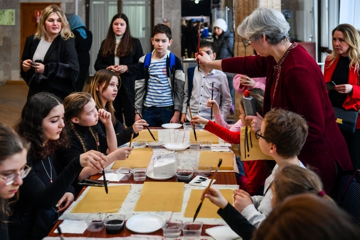 3月3日,在莫斯科國際關(guān)系學(xué)院,小朋友們在中國文化體驗(yàn)活動上學(xué)習(xí)使用毛筆。新華社記者曹陽攝