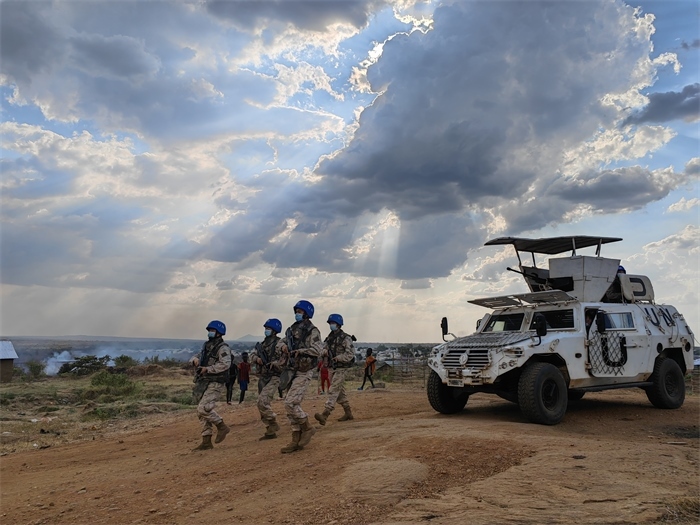 2022年12月,“劉老莊連”隨中國第九批赴南蘇丹(朱巴)維和步兵營奔赴維和戰(zhàn)場(chǎng),重點(diǎn)擔(dān)負(fù)警戒巡邏、武裝護(hù)衛(wèi)、隔離沖突等維和任務(wù)。截至目前,“劉老莊連”累計(jì)行程1500余公里,高標(biāo)準(zhǔn)完成了各項(xiàng)授權(quán)任務(wù),受到聯(lián)南蘇團(tuán)各級(jí)高度贊揚(yáng)。這也是英雄的“劉老莊連”戰(zhàn)旗第一次飄揚(yáng)在非洲大地。