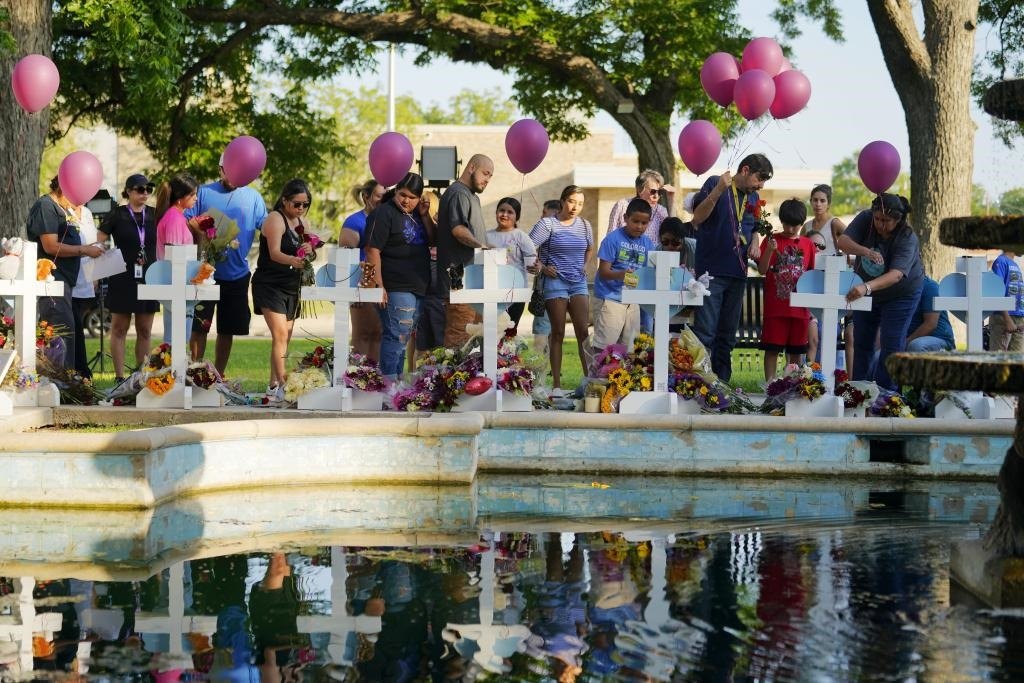 2022年5月26日,在美國得克薩斯州尤瓦爾迪市,人們哀悼槍擊事件遇害者。新華社記者吳曉凌攝