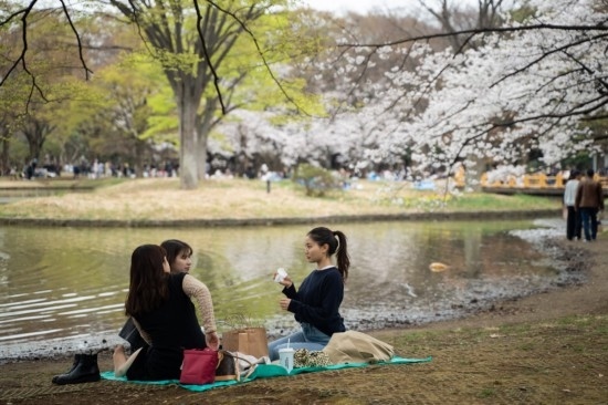 3月21日,人們?cè)谌毡緰|京代代木公園野餐休憩。新華社記者張笑宇攝