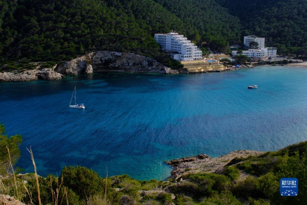 這是4月10日在西班牙巴利阿里群島伊維薩島拍攝的雍加海灣風(fēng)光。
