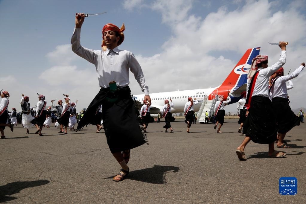 4月15日,在也門(mén)薩那機(jī)場(chǎng),人們?cè)跉g迎戰(zhàn)俘歸來(lái)的儀式上跳舞。