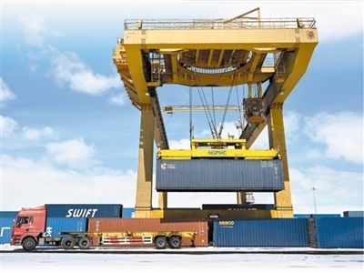 一輛貨車在滿洲里站貨運(yùn)車間集裝箱場裝卸集裝箱。滿洲里口岸是中國最大的陸路口岸,也是中歐班列東通道進(jìn)出境重要口岸。新華社記者 貝 赫攝