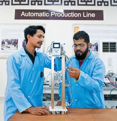在巴基斯坦魯班工坊工業(yè)自動(dòng)化和機(jī)器人專業(yè)課堂上,學(xué)生模擬實(shí)踐電梯組裝運(yùn)行技術(shù)。 巴基斯坦魯班工坊供圖